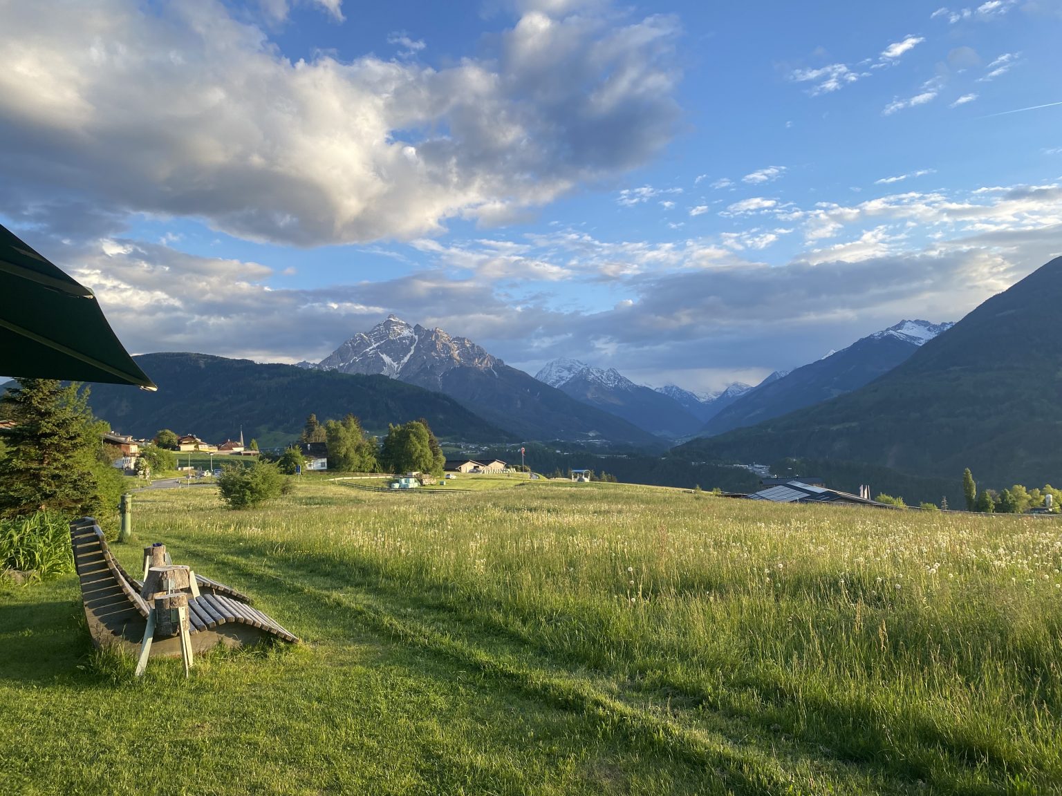 Was er meint, erkennt man sofort, wenn man die Tür zur Terrasse öffnet. Der Blick von der geräumigen Terrasse im Südwesten des Hauses, die fast nahtlos in eine Bergwiese überzugehen scheint, reicht an klaren Tagen vom Stubaier Gletscher bis zur Zugspitze. „Morgens ist die Stimmung am besten, weil das Licht viel besser ist,“ weiß der Hobbyfotograf Hansjörg, der am liebsten Vögel fotografiert, wenn es die Zeit erlaubt und es nicht gerade sehr windig ist. Spitzen bis zu 80 km/h sind durchaus möglich. „Es hat uns die ganze Terrasse schon abgeräumt,“ erzählt Hansjörg. Die meiste Zeit jedoch ist es sehr angenehm.