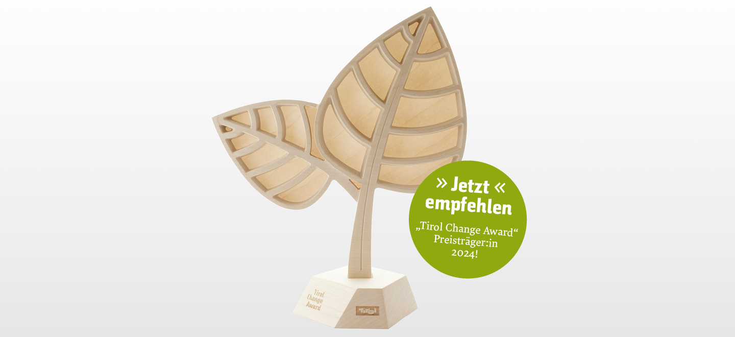 Anhand definierter Kriterien nominieren die Lebensraum Tirol Gruppe sowie externe Expert:innen im „Intendantenprinzip“ zehn Vorzeigeprojekte für den Tirol Change Award, der Ende 2024 im Rahmen des Change Summits verliehen wird.