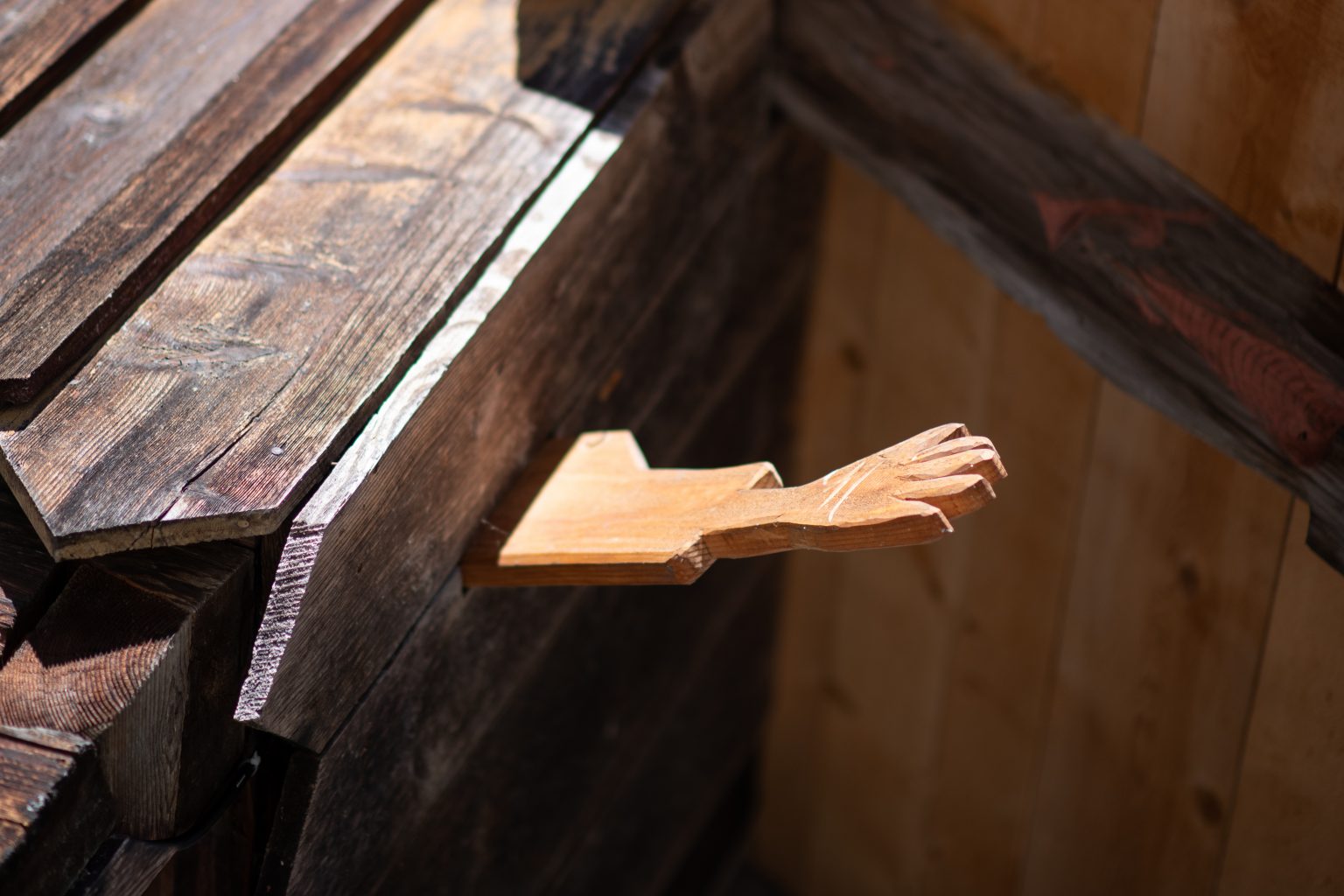 Die Wohlfühl-Energie, mit der dieses Haus seine Besucher:innen empfängt und umarmt, ist erstaunlich. „Ich habe das auch gemerkt. Das ist so ein feines Haus. Das hat wahrscheinlich damit zu tun“, sagt Willi Buchhammer. Mit damit meint er zwei Zeichen auf der Aussenfassade des Hauses. Eine Schlange und eine Hand sind da zu sehen. Stilisiert, verwittert, magisch. „Die sollen Unheil fern halten. Das ist von früher, zur Abwehr von bösen Kräften oder Geistern. Das funktioniert“, weiß Willi.