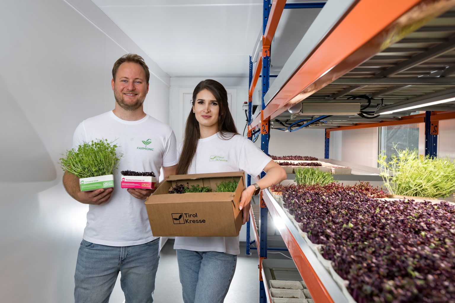 Tirol Kresse verfolgt eine klare Vision: Die Landwirtschaft der Zukunft in die Tiroler Alpen zu bringen. Dabei entwickelt das Unternehmen vollautomatische Robotersysteme unter dem Namen „FARMIONIC“, die in speziell entwickelten Containerfarmen eingesetzt werden. „Die Kund:innen können in unserem Online-Shop verschiedene Kresse-Sorten auswählen und bestellen. Ab dem Zeitpunkt, ab dem die Bezahlung erfolgt ist, fängt der Roboter an, die Bestellungen abzuarbeiten. Die Kund:innen bekommen eine Meldung per E-Mail, dass ihre Bestellung fertig und bereit zur Abholung ist. Ab diesem Zeitpunkt können sie über eine Ausgabeklappe, die sich am Container befindet, ihre Bestellung abholen – und das 24/7“, erklärt Geschäftsführer Stefan Gritsch das System.