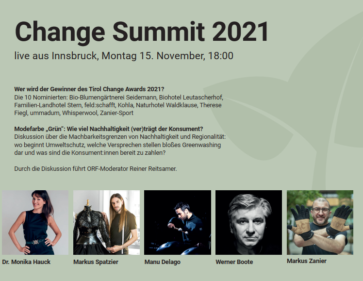 Im Anschluss an die Verleihung des „Tirol Change Awards“ diskutieren führende Experten und Branchenkenner über die Machbarkeitsgrenzen von Nachhaltigkeit und Regionalität in der Textilerzeugung. Dr. Monika Hauck (kreative Ökonomin, Unternehmerin, soziale Aktivistin und City Ambassador der weltweit tätigen sozialen Bewegung Fashion Revolution), Werner Boote („Popstar“ unter den österreichischen Dokumentarfilmern), Modedesigner Markus Spatzier, Handschuh-Hersteller Markus Zanier und der Musiker Manu Delago gehen dabei der Frage nach, wo Umweltschutz beginnt und welche Versprechen bloßes „Greenwashing“ sind. Die Basis des interessanten Diskurses bildet ein modisches Experiment der Marke Tirol. Anlässlich des 20-jährigen Jubiläums der Kollektion Tirol in diesem Jahr ging die Lebensraum Tirol Holding mit ihren Unternehmen Tirol Werbung und Standortagentur Tirol der Frage nach, ob es möglich ist, die legendäre Tirol-Starmütze aus Strick, die bis heute ein Verkaufsschlager ist, ausschließlich aus heimischen Materialien – und gänzlich in Tirol – herzustellen. Mit einem Prototyp gelang ein erster Teilerfolg.