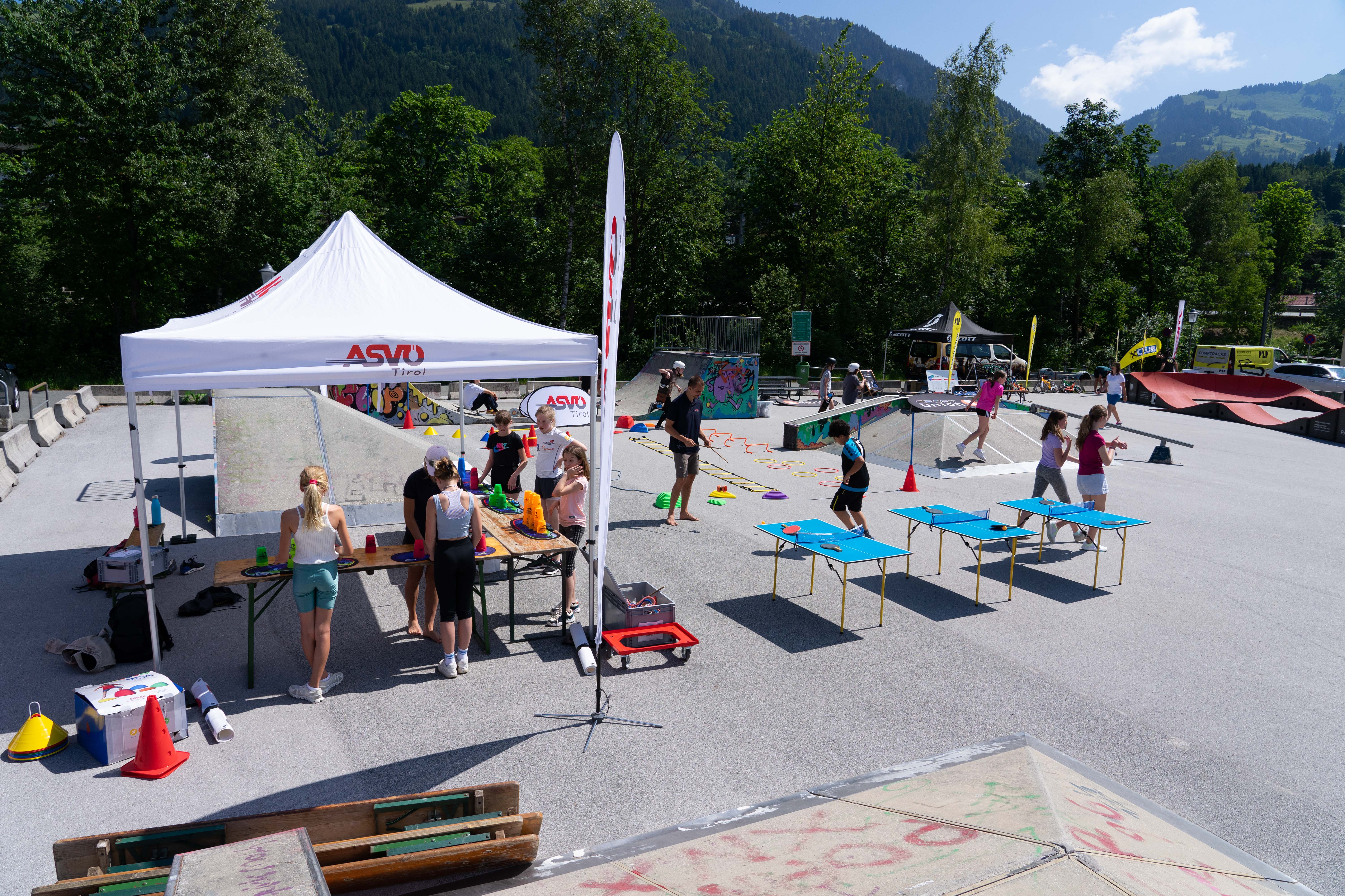 Von einem Riesenwuzzler über einen Pumptrack und einen Kletterturm des Alpenvereins bis hin zu Skate-Workshops bot der letzte Tourstopp im Tiroler Unterland ein umfang- sowie abwechslungsreiches Angebot. Ein wichtiger Teil der Tour war das „Bewegungs-ABC“, das vom Förderverein Nachwuchsleistungssport Tirol entwickelt wurde. Hier konnten Kinder zusammen mit Trainer:innen Bewegungsabläufe wie „Laufen“, „Springen“, „Werfen und Fangen“, „Rollen und Unterstützen“ spielerisch erlernen und verinnerlichen. Jeden Vormittag hatten auch Grundschulklassen die Möglichkeit, ihre individuellen motorischen Stärken beim Talentscouting zu demonstrieren.