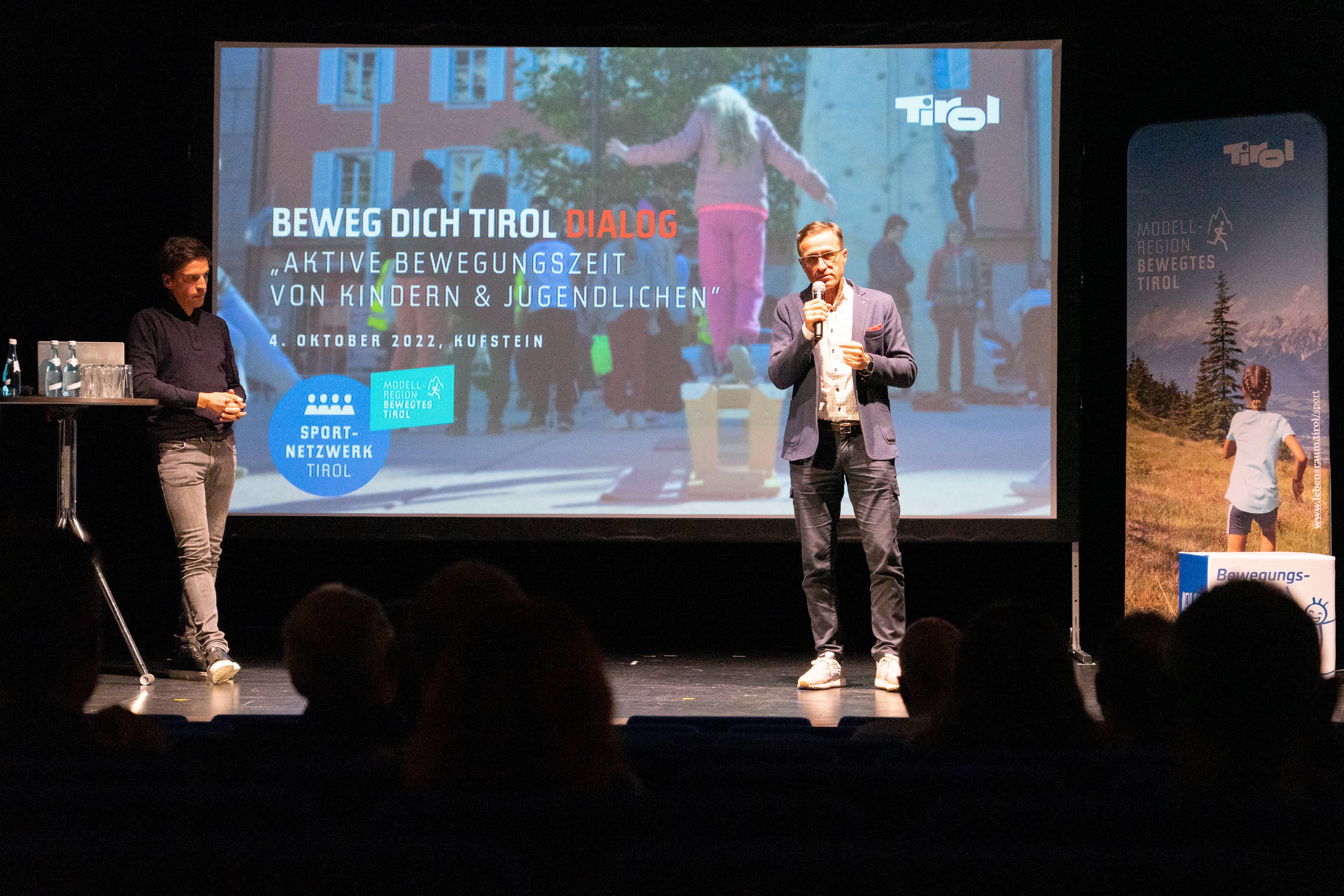 Am Auftaktabend fand der erste „Beweg dich Tirol Dialog“ zum Thema „Aktive Bewegungszeit von Kindern und Jugendlichen“ statt. Ex Radprofi Thomas Rohregger lud im Namen des Sportnetzwerkes Tirol ins Kultur Quartier Kufstein zum Impulsvortrag von Dr. Werner Kirschner vom Institut für Sportwissenschaften der Universität Innsbruck. Bei der anschließenden Diskussionsrunde brachten Expert:innen, Vertreter:innen der Dachverbände, Sportlehrer:innen und natürlich auch Sportler:innen aus dem Bezirk ihre Ideen und Vorschläge ein, wie für Kinder und Jugendliche ein zielgerichteter Zugang zu Sportangeboten und auch Vereinen geboten werden kann. Unter den Gästen waren Eva Dollinger, ehemalige österreichische Triathletin und Olympia-Teilnehmerin, der ehemalige österreichische Skispringer und Vorstand der Abteilung Sport des Landes Tirol, Reinhard Eberl und Andrea Graus, ehemalige Rennradprofi.