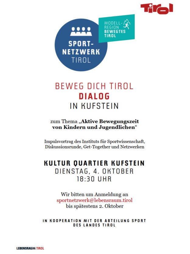 Beim Tourstopp in Kufstein wird am Dienstag, den 04. Oktober um 18:30 Uhr im Kultur Quartier Kufstein der „Beweg dich Tirol Dialog“ zum Thema „Aktive Bewegungszeit von Kindern und Jugendlichen“ stattfinden. Dieser wird in Kooperation mit der Abteilung Sport des Landes Tirol abgehalten – neben einem Impulsvortrag ist eine anschließende Diskussionsrunde mit Get-Together geplant.