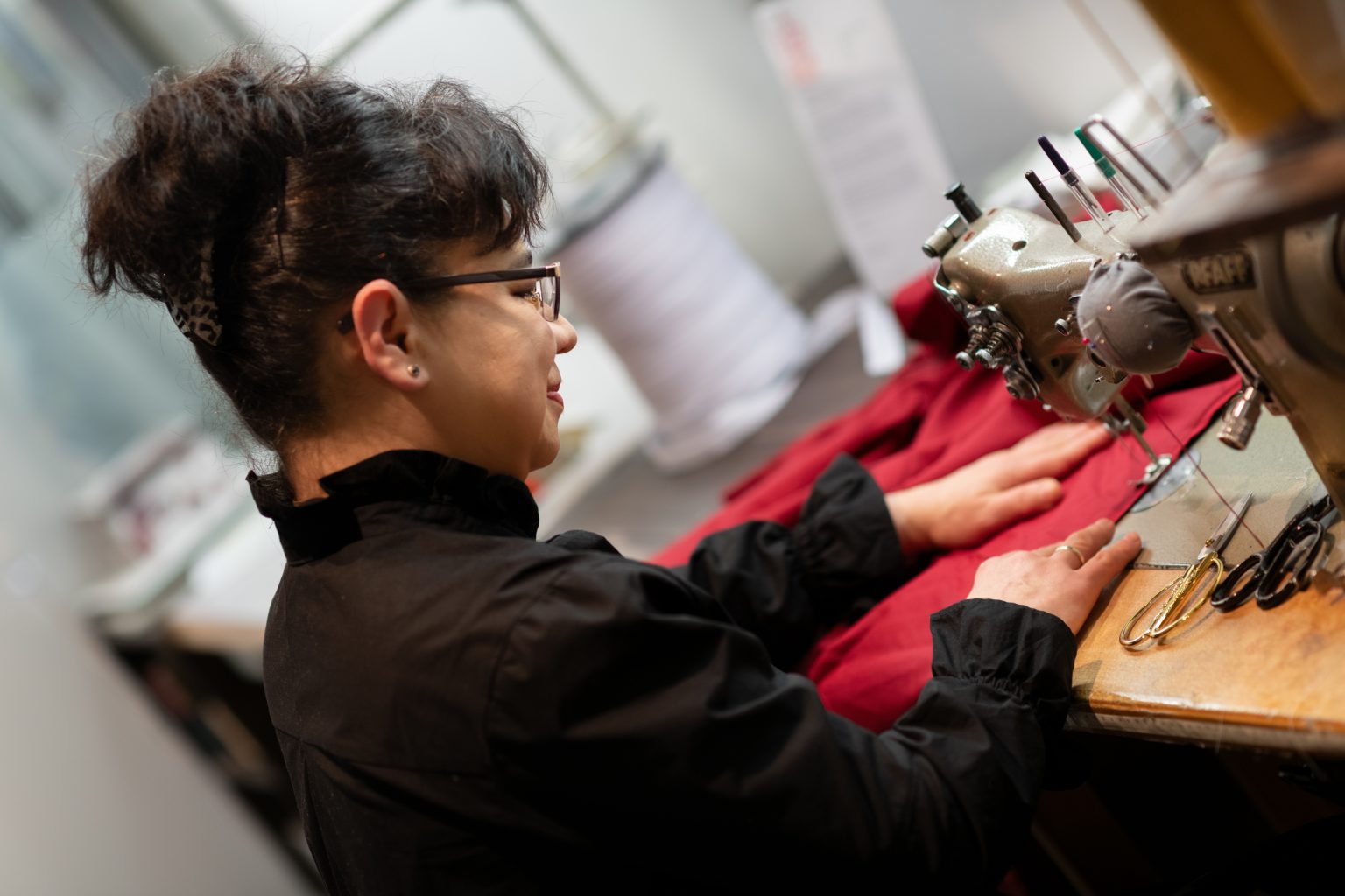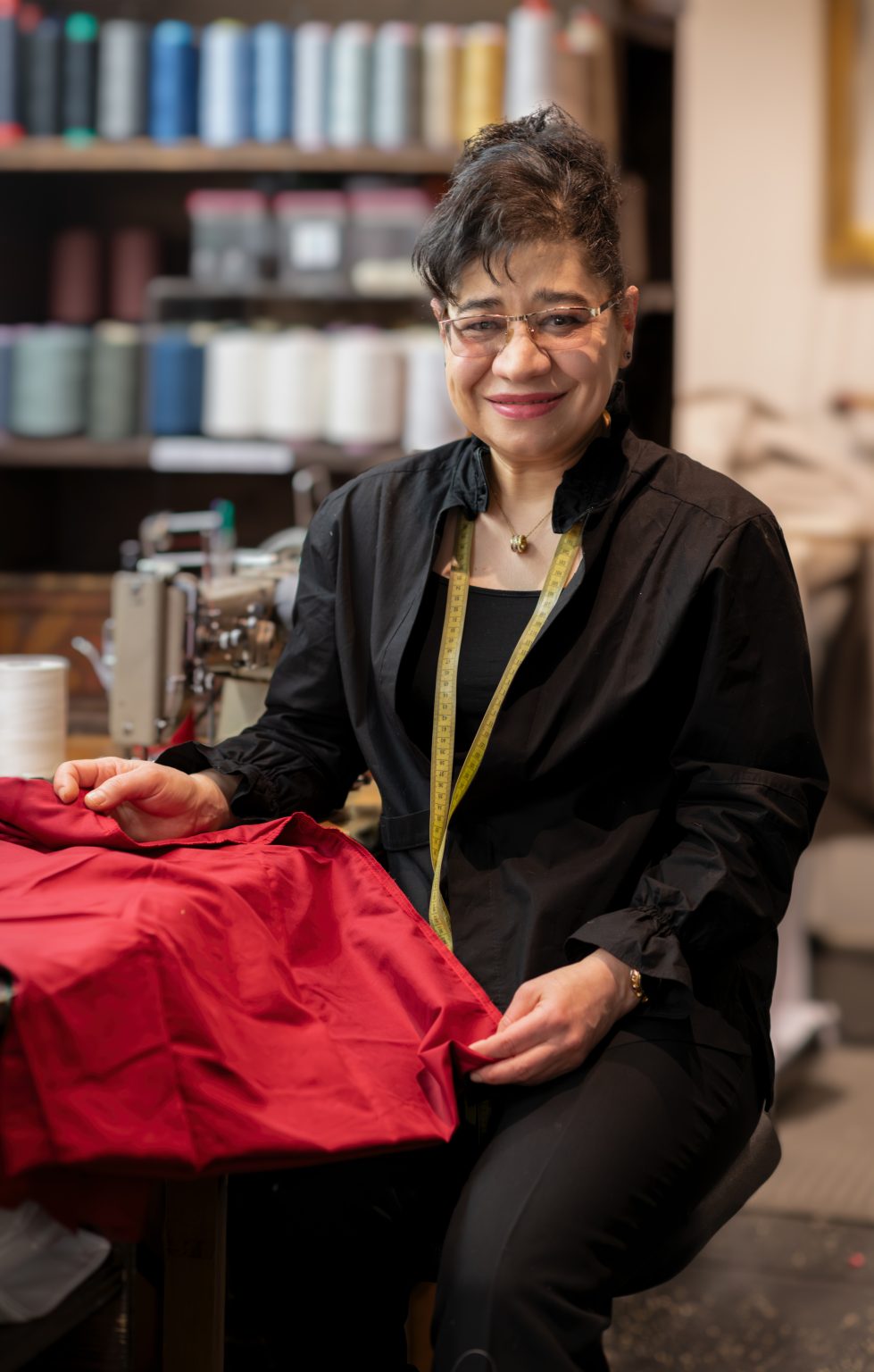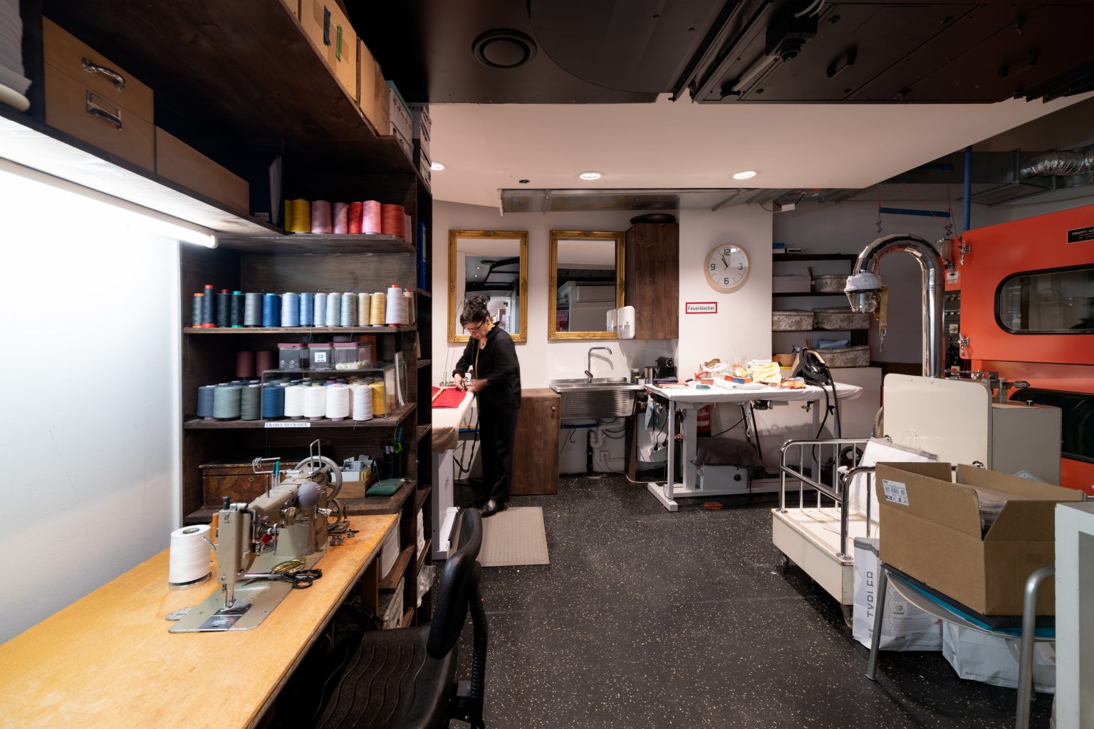 Bettwäsche, Heimtextilien und noch mehr zu nähen und zu reparieren, ist ihr Job. Dass sie ihn gerne macht – mit dem guten Stolz einer guten Handwerkerin – ist auch in Windeseile spürbar. Um ihren Hals hängt ein gelbes Maßband – allzeit bereit, um seinen genauen Dienst zu versehen. „Das muss ich immer dabei haben“, sagt sie. An ihrer Hüfte hängt eine Ledertasche, die ein wenig an den Gürtelholster von Cowboys erinnert und Akidas Schere stets griffbereit hält.