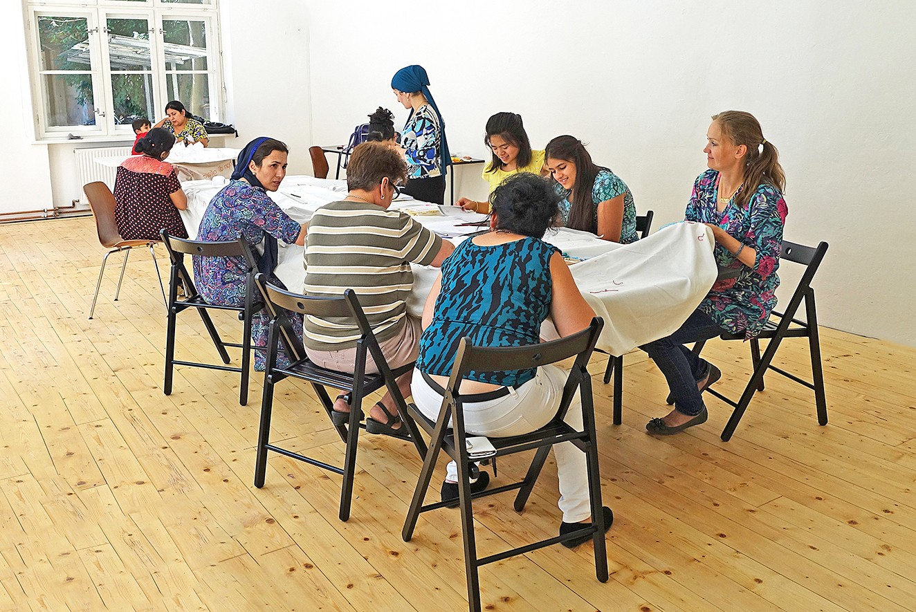 Gemeinsam sticken Flüchtlinge und Tiroler:innen für den inneren Frieden.